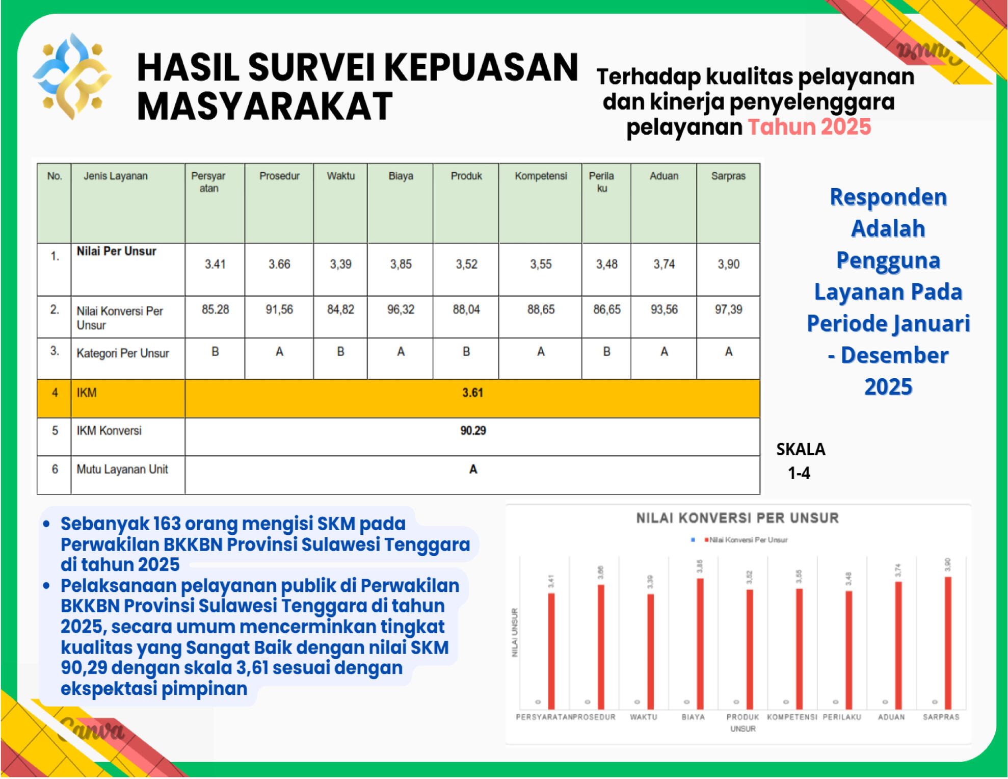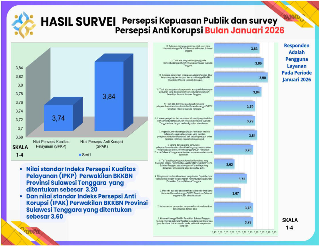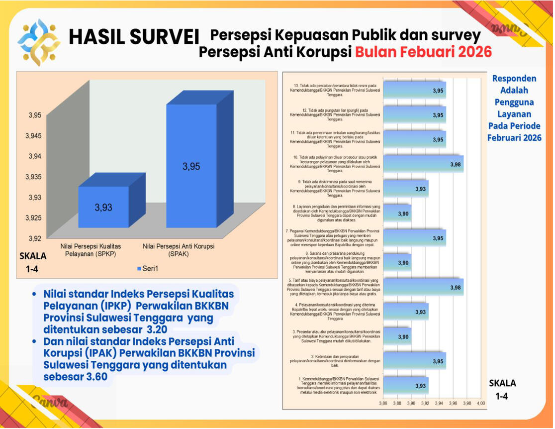 1.Survei Persepsi Kualitas Pelayanan (SPKP). Hasil survei,diketahui nilai Indeks Persepsi Kualitas Pelayanan (IPKP) pada Perwakilan BKKBN Provinsi Sulawesi Tenggara sebesar 3.74 yang berada diatas nilai standar yang ditentukan yaitu 3.202. Survei Persepsi Anti Korupsi (SPAK). Selanjutnya berdasarkan hasil survey bahwa nilai Indeks Persepsi Anti Korupsi (IPAK) pada Perwakilan BKKBN Provinsi Sulawesi Tenggara adalah sebesar 3.84 dengan nilai standar 3.60