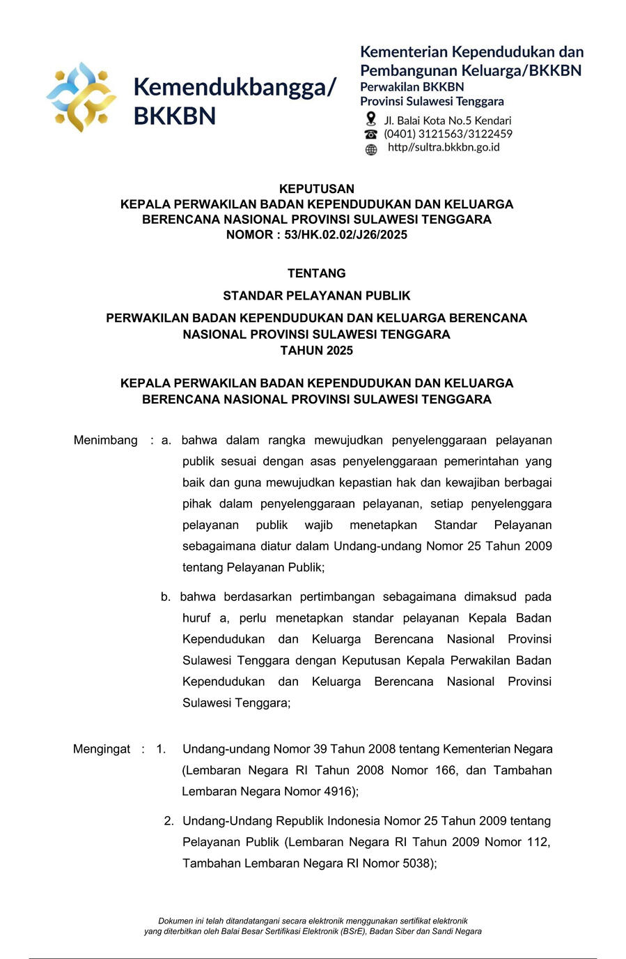 KEPUTUSAN KEPALA TENTANG STANDAR LAYANAN PERWAKILAN BKKBN PROVINSI SULAWESI TENGGARA